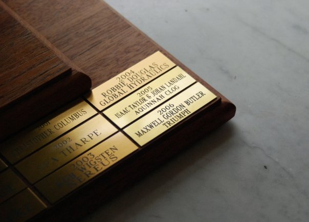 For some, those last tweaks could mean the difference between a life of anonymity among the motley roster of skippers, or a legacy of eternal glory etched in shining brass. To the overall fastest craft across the line that day would go the prize of Line Honors, with a sizable monetary and alcoholic purse. More importantly, though, the skipper’s name and year of victory were emblazoned on a brass plaque affixed to the hallowed Commodore’s Cup. It was a beautiful wooden sloop on a stand, once owned by the late, legendary WYRC Commodore Gordon Otis, the story of whom was written in Bacardi and brown acid on the pages of Vineyard mythology. To have one’s name on The Cup was to be ordained to the highest order of reverence by Gordo, the God of Good Times himself. At the commencement of every Challenge, a solemn dedication and moment of silence was given in Gordy’s honor, sailor and spectator alike knowing that he would look down and see us through another one. I had no ambitions of my name gracing The Cup; it was the domain of the elders, the salts, the Big Dogs. I was too green yet. Or was I?