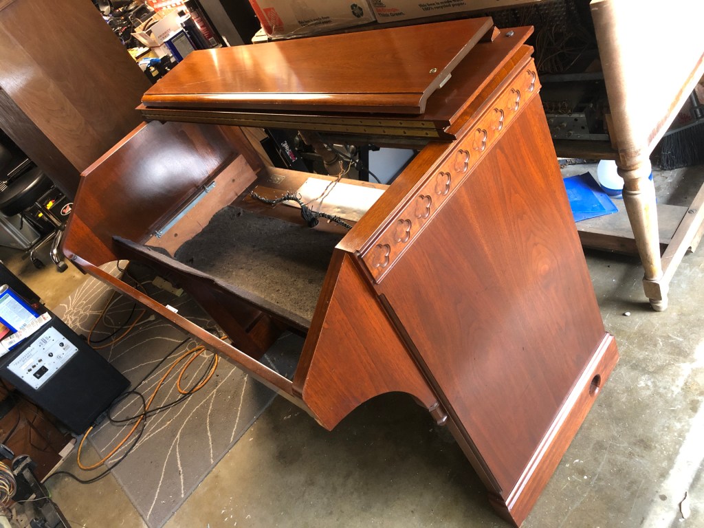 I disassembled, cleaned, repainted in hammered bronze, re-bulbed with a 5 watt LED unit, and re-wired the pedal clavier lamp. I’ll never really need this, because my pedaling skills are about on par with my pole vaulting skills, but it looks cool and the details ought to be sweated. Sweaten. Swet.