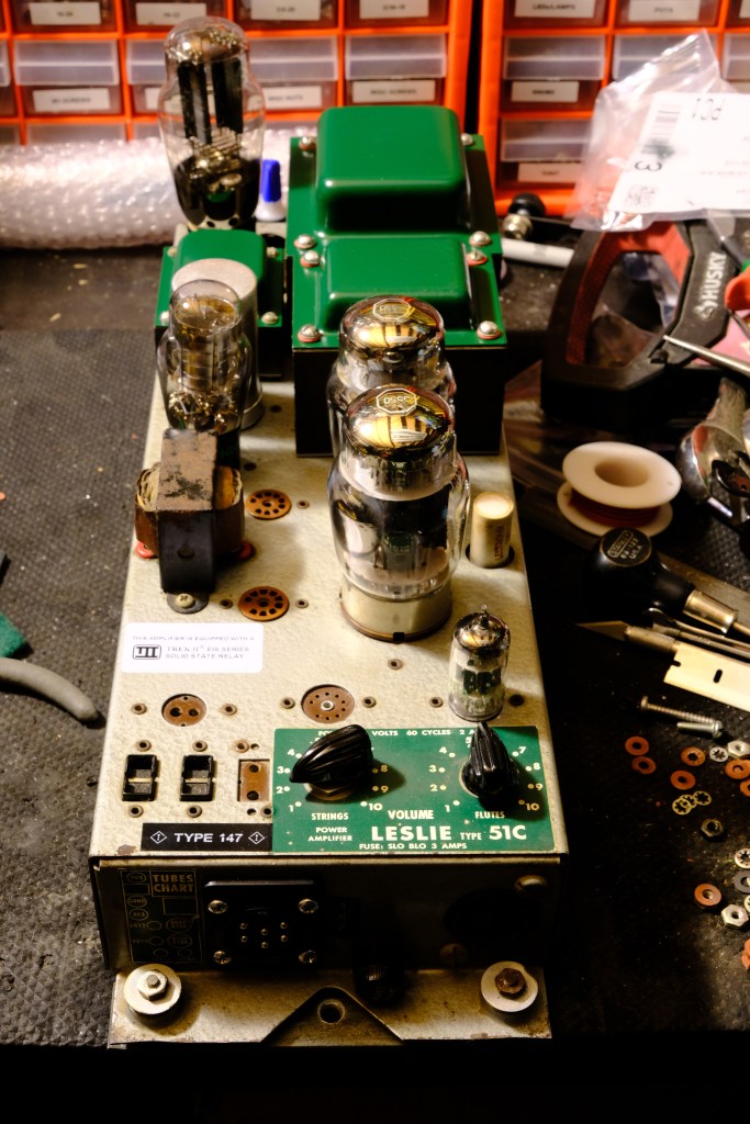 I found a banged up, sweaty, untested Leslie model 51C on a local eBay listing. The Buy It Now price was good, but not a steal. After all, a 51C even in top nick is neither a 122- nor 147-type hookup without modification, meaning it’s not plug-and-play with Hammond organs. It’s a two-channel model meant for Conn organs (hence the “C”), with the rotary channel carrying the flute ranks and a stationary channel for the strings. It’s also a one-speed job, with no slow speed like the canonical models have. Hence it needs either a complicated and expensive motor conversion or a simpler, almost-as-expensive, not-as-good motor controller to get the de rigueur chorale function. With the proper modifications, it essentially becomes a 147, albeit with tube rectification and 35 watts of power instead of 40. Certainly nothing I wasn’t willing to undertake, but my nose for deals wasn’t quite twitching yet.